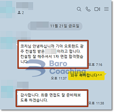 바로코칭에서 컨설팅 받은 학생의 기아자동차 면접 합격 후기입니다.
