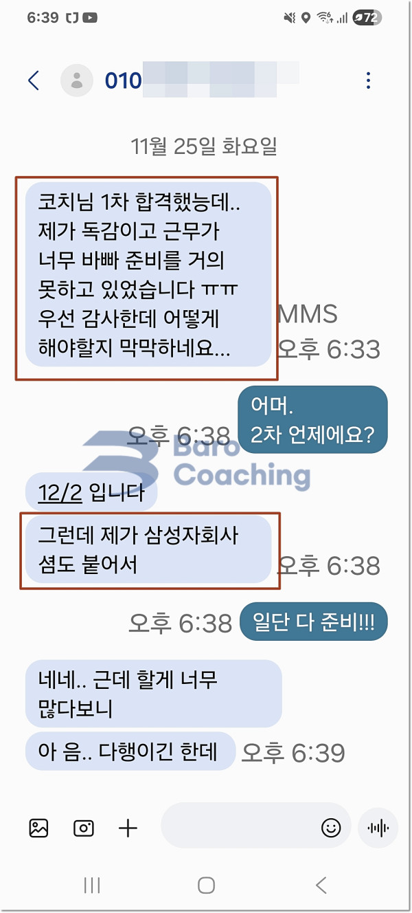 바로코칭을 통해 합격한 수강생들의 실제 문자/카톡 후기를 모았습니다.