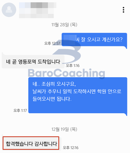 바로코칭을 통해 합격한 수강생들의 실제 문자/카톡 후기를 모았습니다.