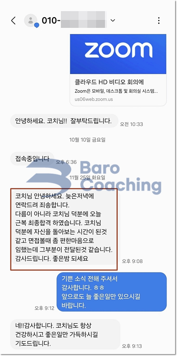 바로코칭을 통해 합격한 수강생들의 실제 문자/카톡 후기를 모았습니다.
