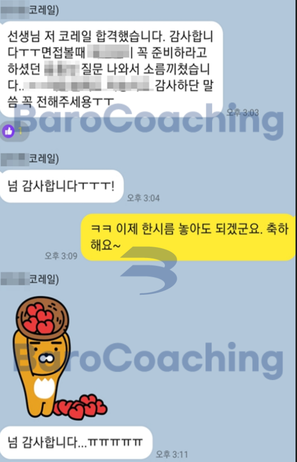 바로코칭을 통해 합격한 수강생들의 실제 문자/카톡 후기를 모았습니다.