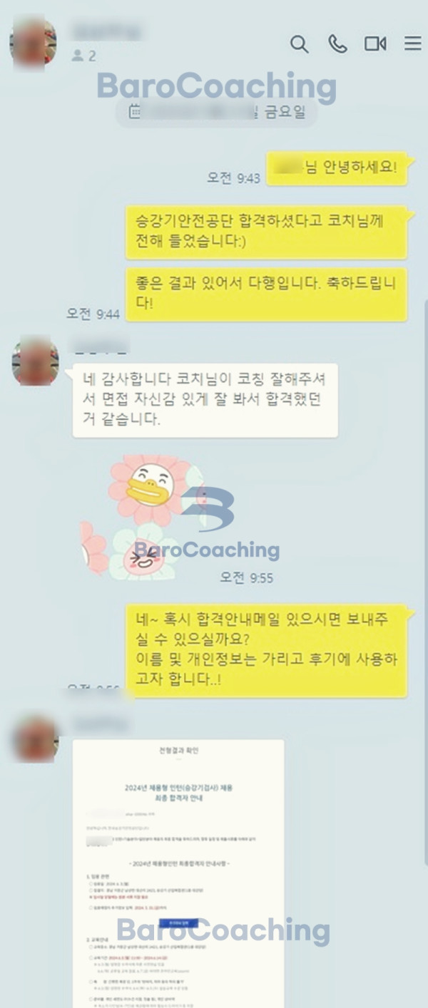 바로코칭에서 컨설팅 받은 학생의 한국승강기안전공단 면접 합격 후기입니다.