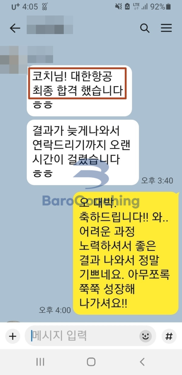 바로코칭을 통해 합격한 수강생들의 실제 문자/카톡 후기를 모았습니다.