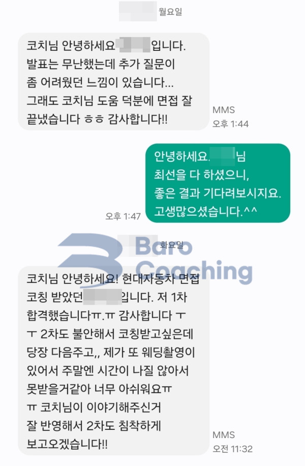 바로코칭을 통해 합격한 수강생들의 실제 문자/카톡 후기를 모았습니다.
